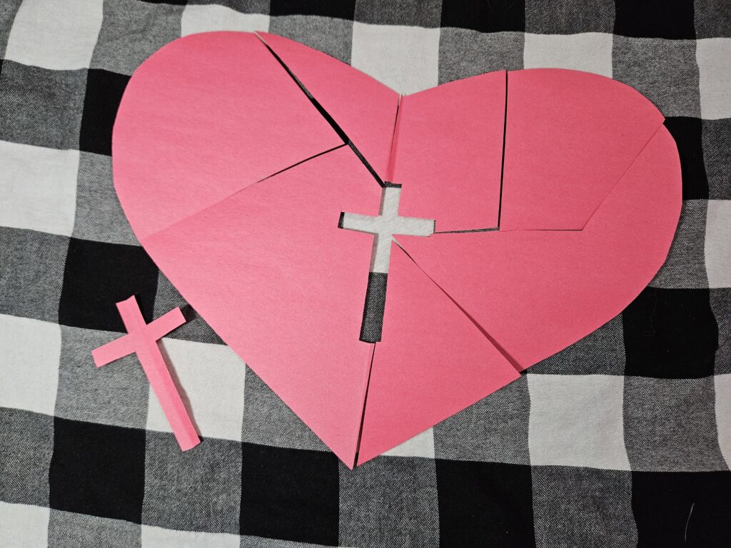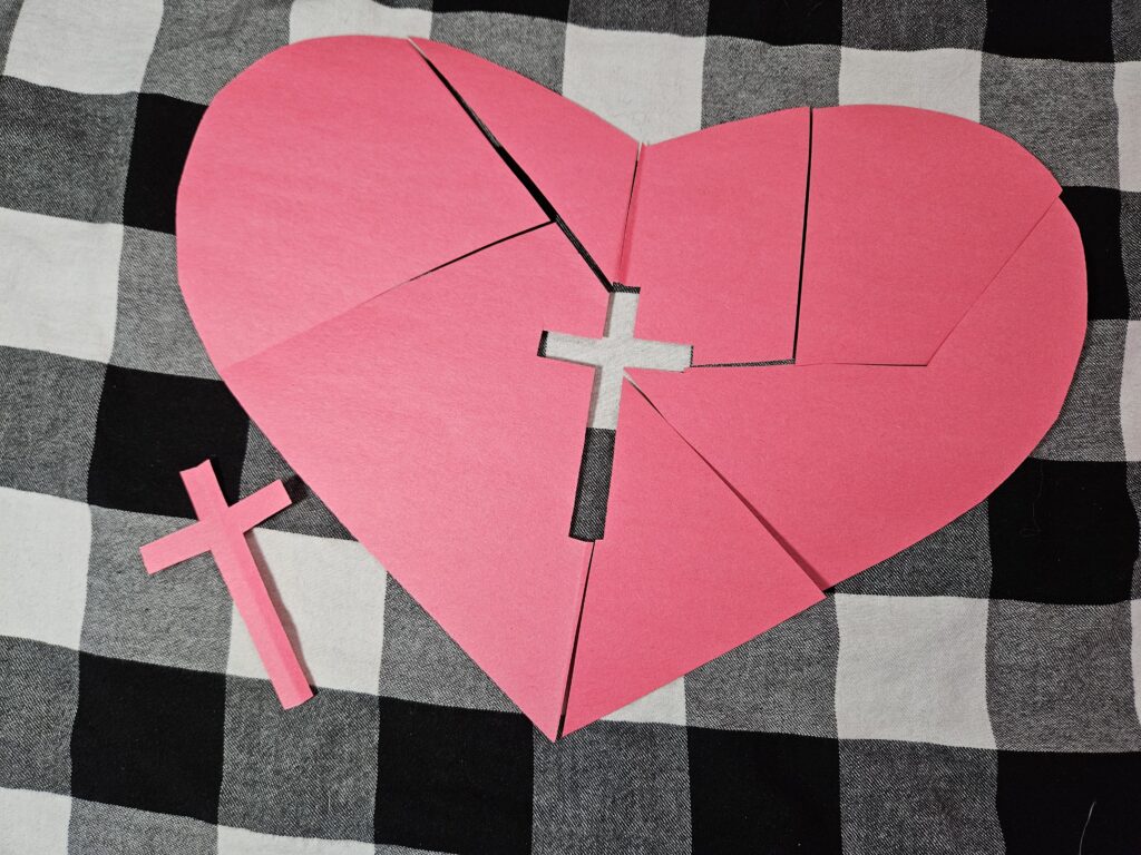 - Fold the paper in half and cut out a large heart then also cut out a cross from the large heart. Take the large heart and cut puzzle pieces from it. Your audience will put the heart together. (The number of pieces that you make will depend on the age of your students. You may want to have a print on one side of the paper as well to help them put the puzzle together, or another way for them to know which side is up. You can also give them the outline of the heart, the scraps from when you cut it, as a border so they know how big it will be.)