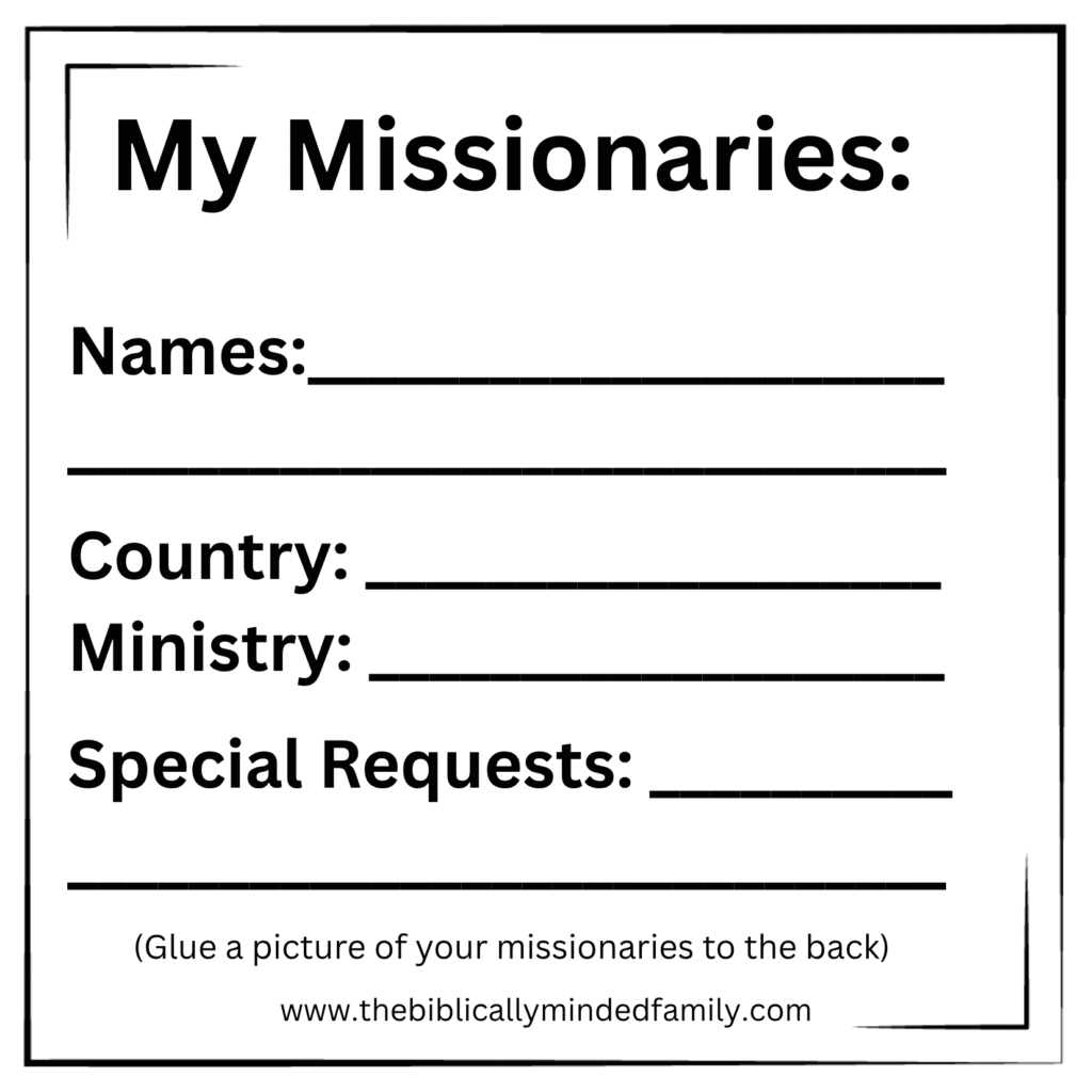 Print out this Missionary card four to a page and cut them into cards. Then fill in the information about your friends and glue their picture on the back of the card. Store these in a place your family gathers — like on the dining table so you can remember to pray for your friends at mealtimes or Bible time.