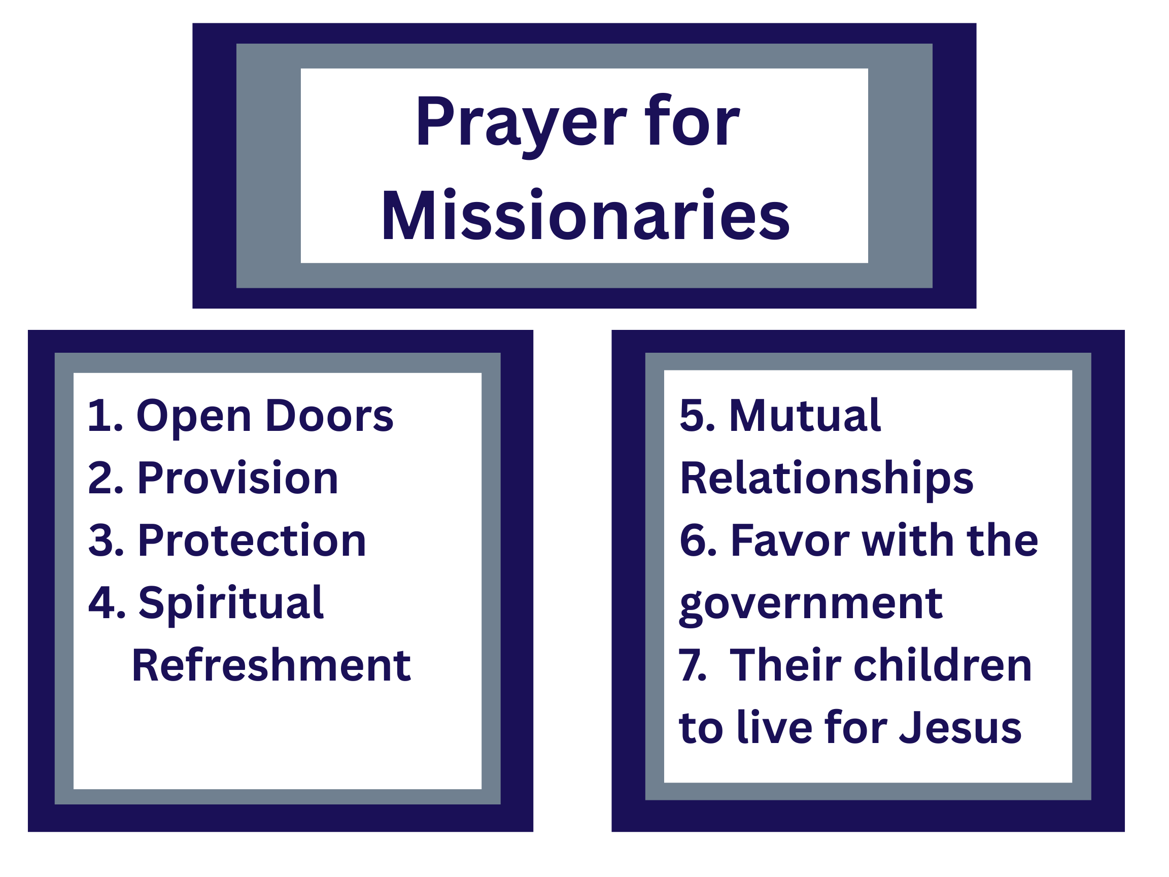Print out this prayer sheet as a way to remember the seven prayer requests in this article. Intentionally pray for your missionaries using this prayer guide on a regular basis. You can hang it on the wall, store it in your Bible, or keep it with your missionary cards.